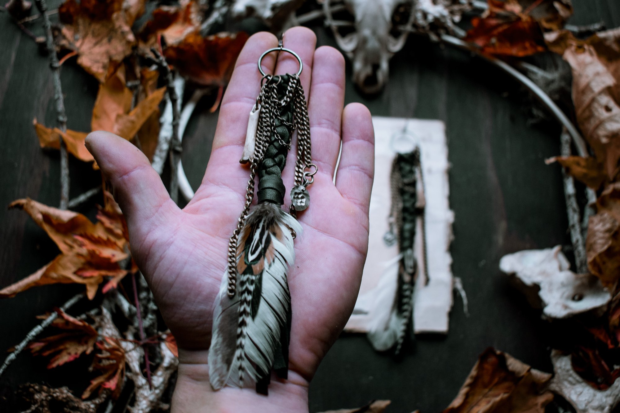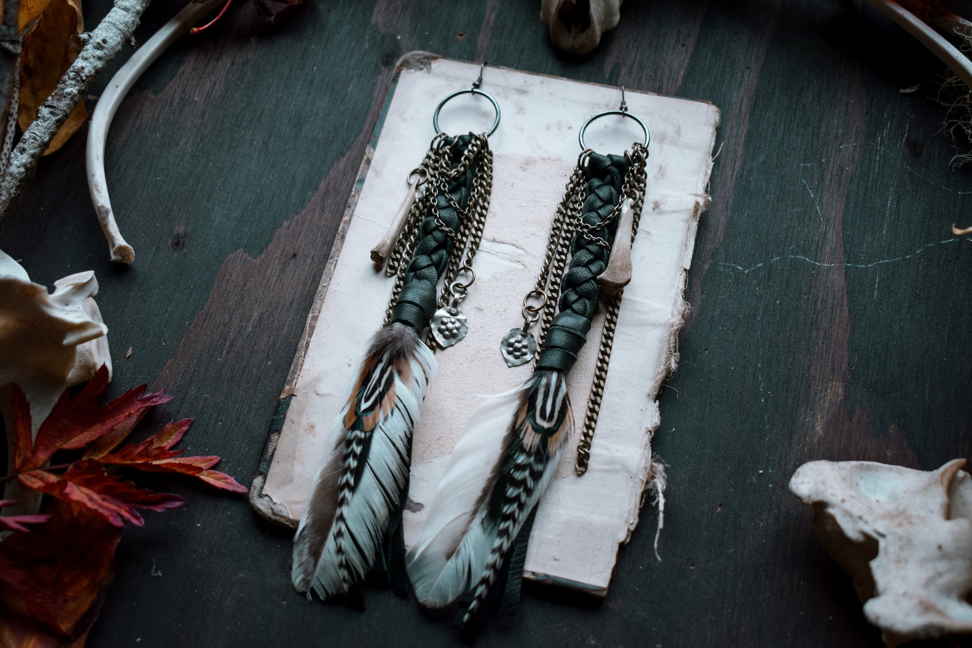 handmade braided leather, feather and bone earrings adorned with antique charms and chains
