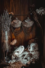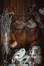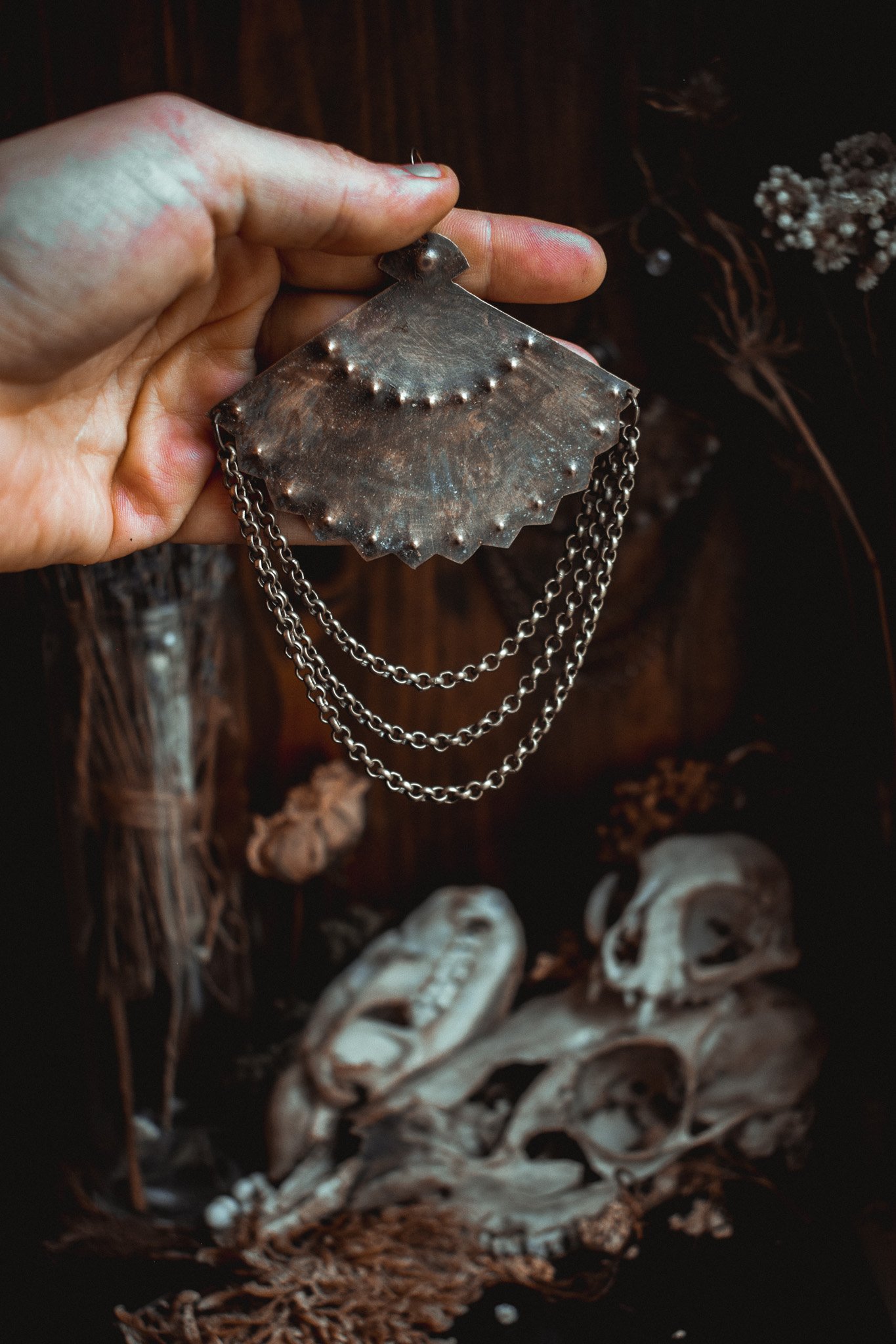 A pair of earrings created with hand cut brass that has textured and adorned in layers of brass chains.