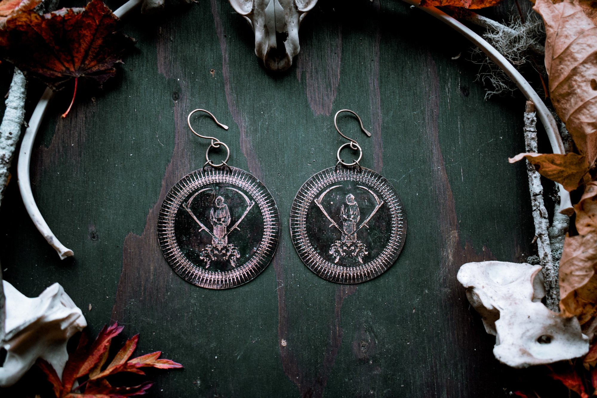 Death Worship etched brass ear hangers