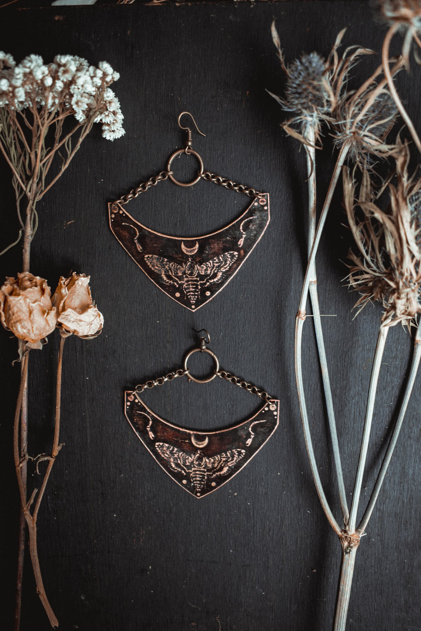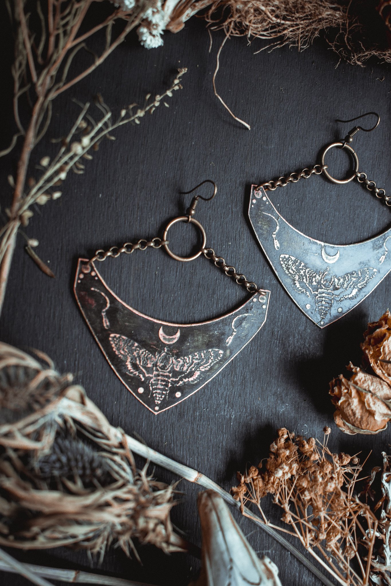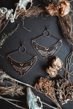A pair of earrings created with hand cut brass that has been etched with the image of a month, moon and 2 sickles.