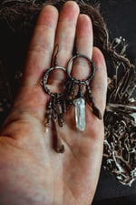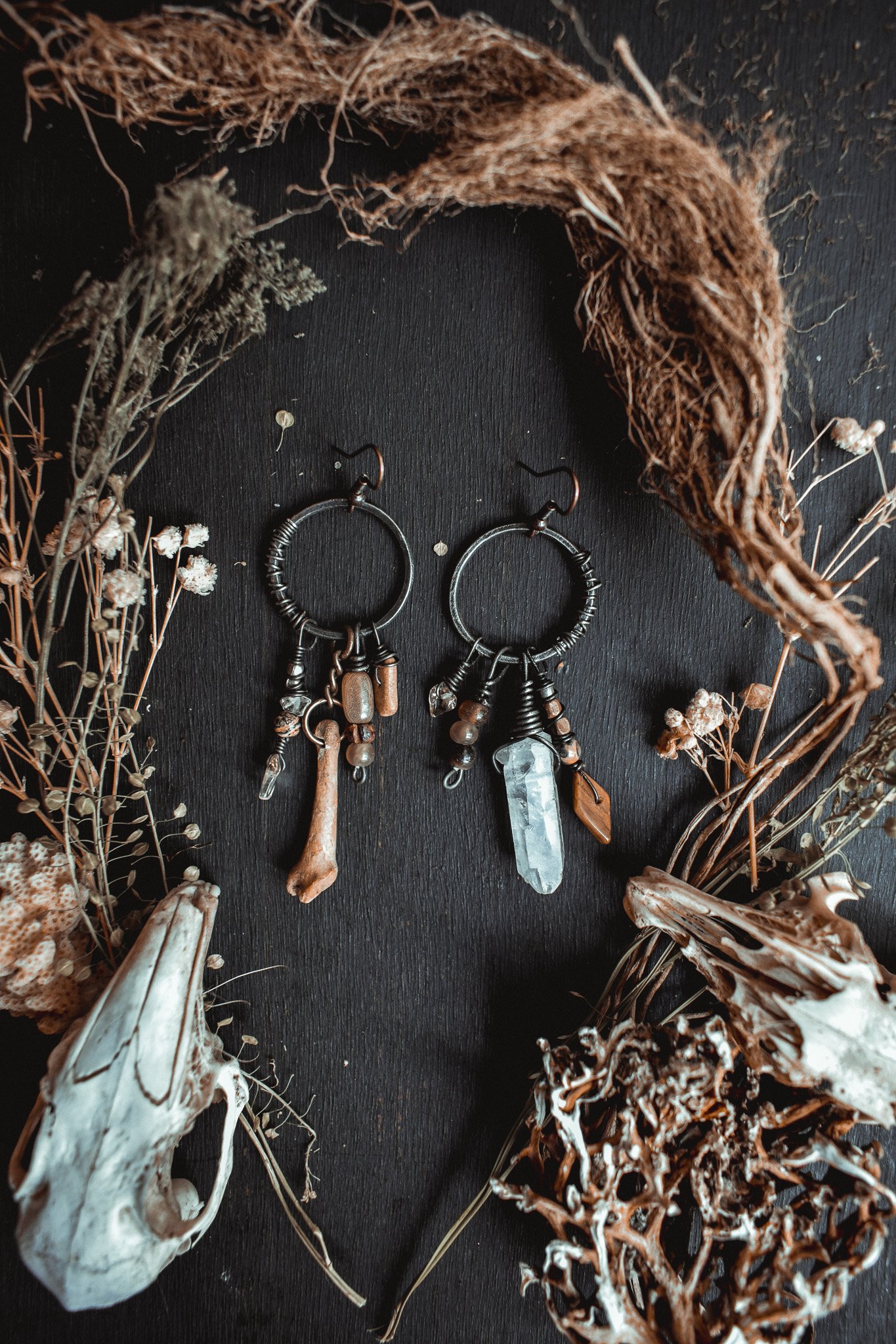A pair of earrings created with hammered wire, salvaged bones, salvaged beads and crystal