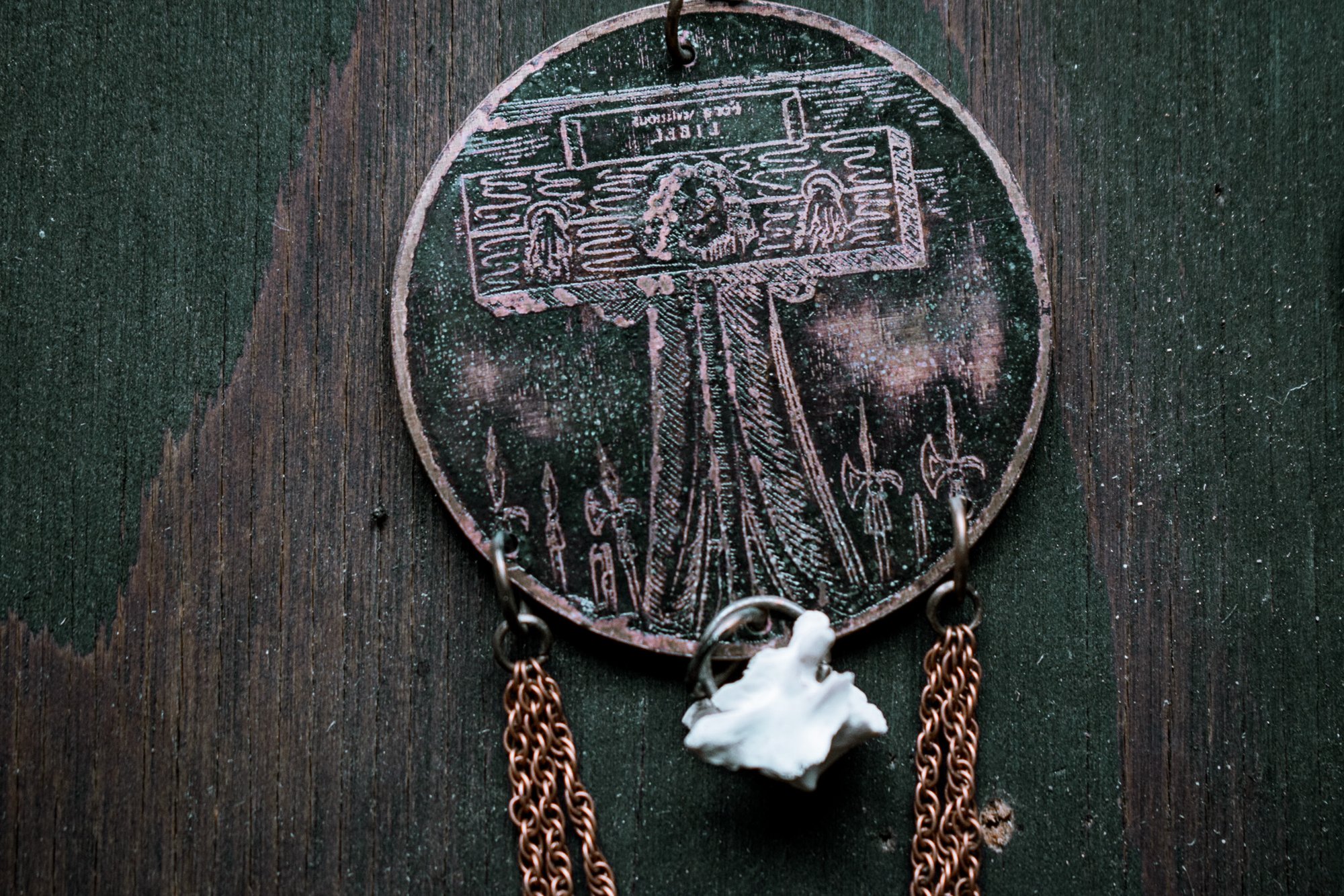 handmade etched brass earrings adorned with snake vertebrae and copper chains
