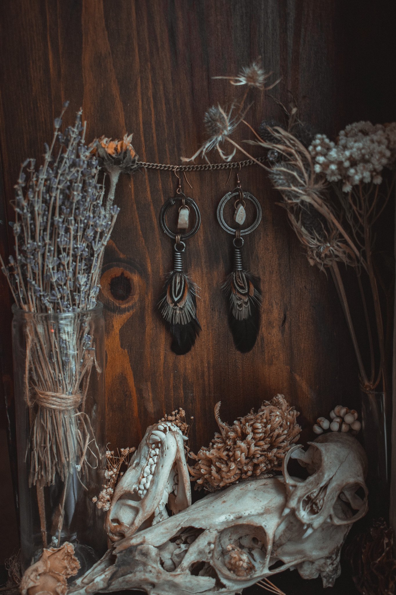 A pair of earrings created with hammered wire, salvaged pheasant/hen feathers and sawed deer rib beads