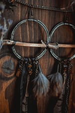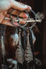 A pair of earrings created with hammered wire, salvaged bones, secondhand leather, rabbit fur, brass chain accents, secondhand beads and pheasant feathers