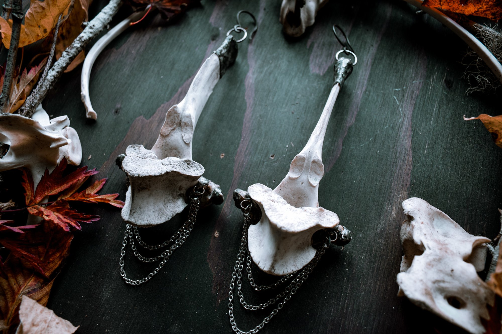handmade large silver soldered elk vertebra ear weights adorned with chains