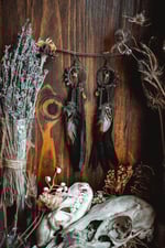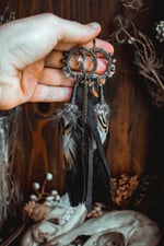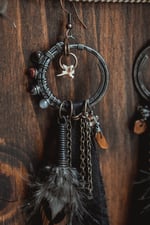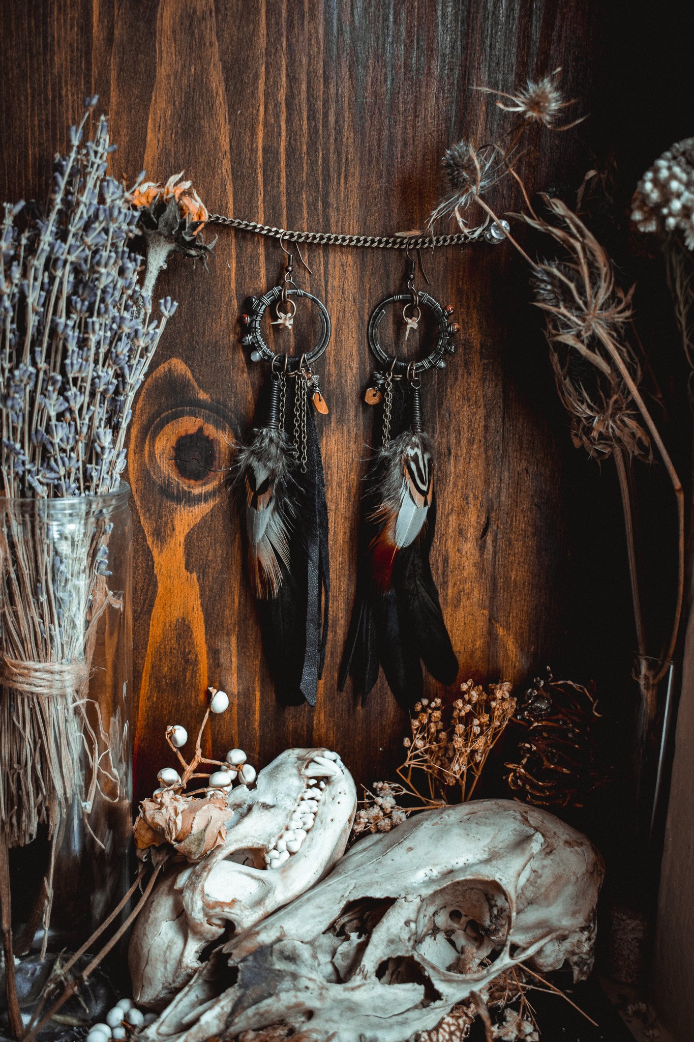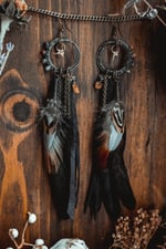 A pair of rustic assemblage earrings created with hammered wire, jasper bead accents, salvaged snake vertebra, secondhand leather, chains and salvaged feathers.