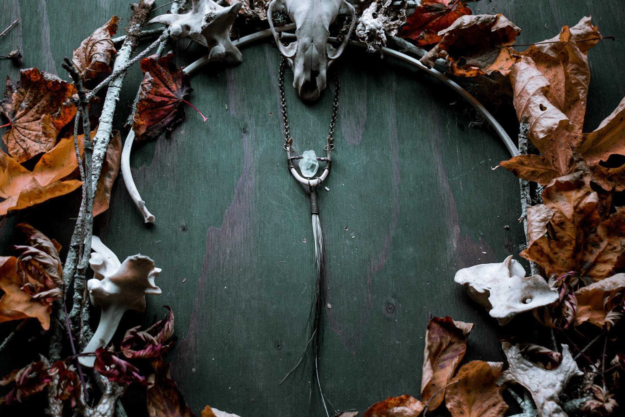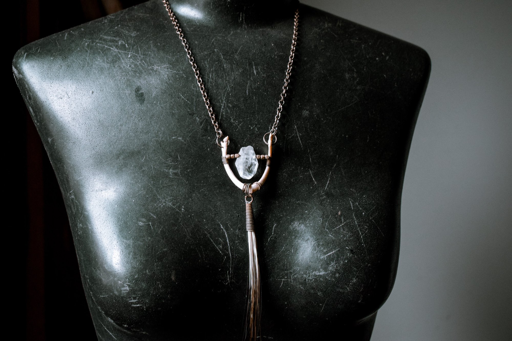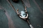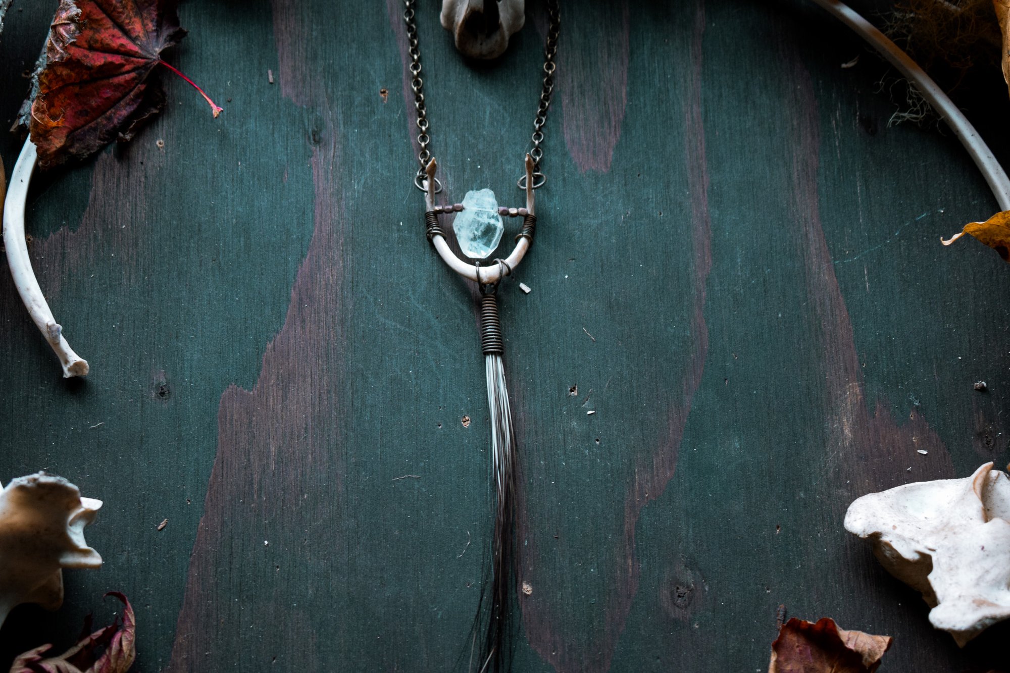 handmade turtle jaw, quartz crystal and porcupine fur necklace